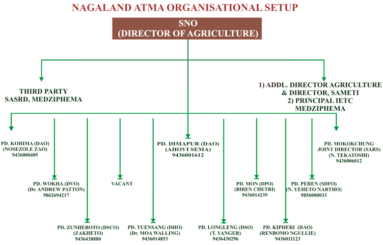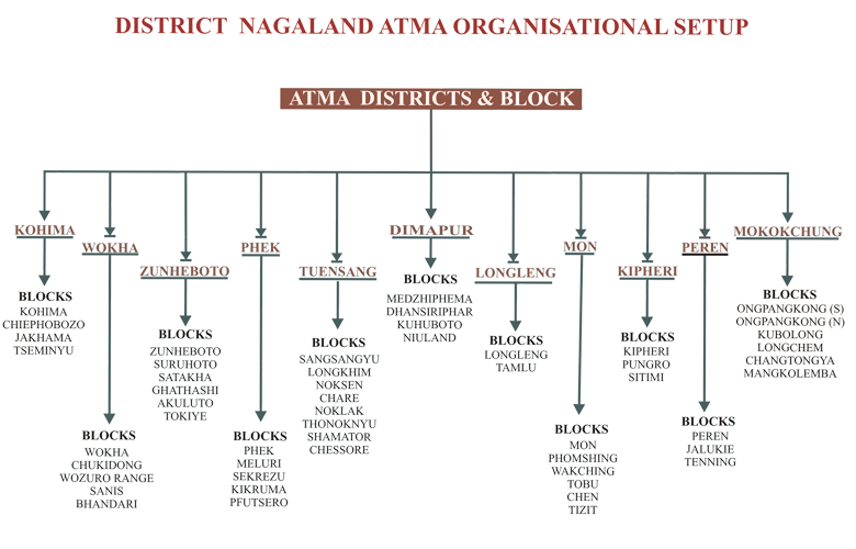 Nagaland ATMA Organizational Setup consists of the Director of Agriculture as the State Nodal Officer. The Director Sameti, Principal IETC Medziphema and Third Party SASARD, Mephiphema. The 11 Districts Kohima, Wokha, Zunheboto, Phek, Tuensang, Dimapur, Longleng, Mon, Kiphire, Peren and Mokokchung headed by the respective DAOs function under the State Nodal Officer. The districts have their respective blocks under ATMA Organizational Setup.